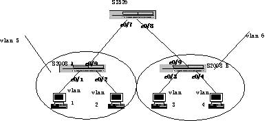 Quidway S3526以太网交换机通过端口Ethernet 0/7和端口Ethernet 0/8下接两台Quidway S2008以太网交换机。S2008 A上VLAN5为primary VLAN,包含上行端口Ethernet 0/9和两个secondary VLAN:VLAN1和VLAN2,VLAN1包含端口Ethernet 0/1,VLAN2包含端口Ethernet 0/2;S2008 B上VLAN6为primary VLAN,包含上行端口Ethernet 0/9和两个secondary VLAN:VLAN3和VLAN4,VLAN3包含端口Ethernet 0/3,VLAN4包含端口Ethernet 0/4。从S3526看,下接的两个S2008都只有一个VLAN,S2008 A的VLAN5,S2008 B的VLAN6。