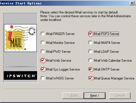 Next下一步来到这个画面,我们只要勾上这些服务就行了,如果没勾上 Imail Web Service 就无法基于网页收发信,Imail Web Calendar Service是基于网页日程表,POP3 和 SMTP 是收发信一定要的。照这个图勾选,按Next 下一步