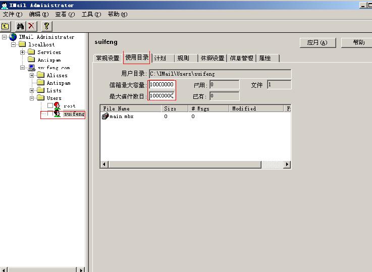 点击你新建的用户再点右边窗口的目录,看到信箱的最大容量了吧,输入10000000 再点应用,现在的信箱就是10M大小。(注:容量大小单位是字节数,0代表无限大小,10000000代表10兆容量。最大信件数目道理一样,0代表无数目限制,比如,限制了10M的容量,并限制了最大信件数目为15,那么超过10M的信无法传进来,如果没有超过10M,但超过有15封信,则第15封之后的信都会退回,还可以设置单封信的最大的容量。)