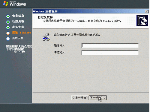 下面输入用户的姓名和单位名称,如图5所示,输入完毕后点击“下一步”按钮继续。