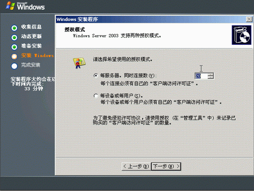第二次是关于网络方面的设置,如图7所示,对于单机用户和局域网内客户端来说,直接点击“下一步”按钮继续即可,但对于服务器来说,要设置此服务器供多少客户端使用,此时需要参考说明书的授权和局域网的实际情况,输入客户端数量。设置完毕后,点击“下一步”继续。