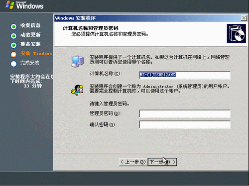 下面是设置计算机的名称和本机系统管理员的密码,如图8所示,计算机的名称不能与局域网内其他计算机的名称相同,管理员的密码设置要安全,最好是数字、大写字母、小写字母、特殊字符相结合,然后点击“下一步”继续。