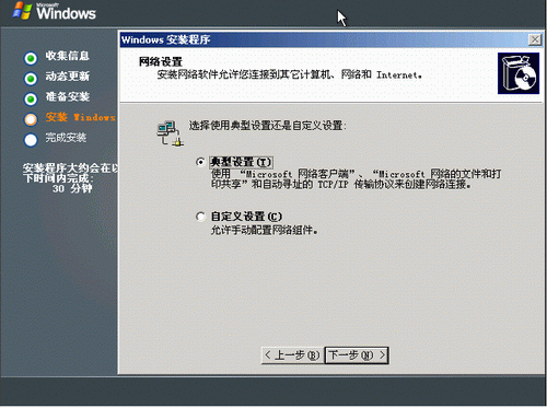 下面是系统关于网络的设置,如图9所示,在这里可以选择“典型设置”,在安装完毕后再进行调整。