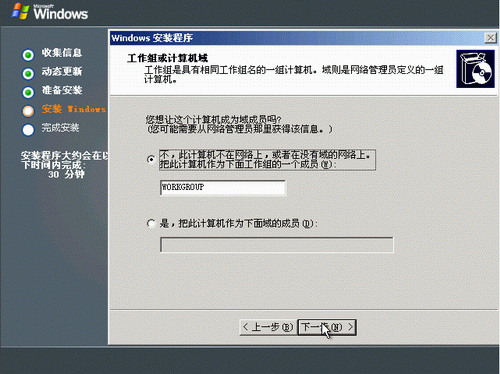 在设置工作组或计算机域的时候,如图10所示,不论是单机还是局域网服务器,最好是选中第一项,当把系统安装完毕后再进行详细的设置。