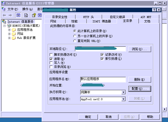 展开'服务和应用程序'-->internet信息服务-->找到你要映射的站点目录-->右键点击属性 -->在主目录中点击'配置'-->在应用程序映射中点击添加 -->可执行文件填写“ C:\WINDOWS\Microsoft.NET\Framework\v2.0.50727\aspnet_isapi.dll ”-->